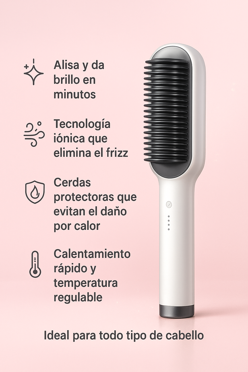 ¡Sí! Funciona en cabellos lisos, ondulados, rizados o con frizz. Solo ajusta la temperatura según tu tipo de cabello y disfruta un alisado suave y brillante.